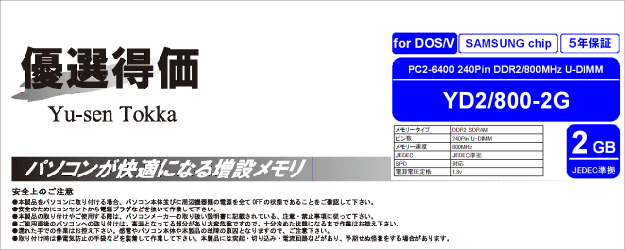 【パソコンが快適になる増設メモリ】【デスクトップ用 新品メモリー2GB】【本体とセットで送料無料】YD2/800-2G(PC2-6400)
